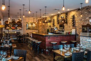 Silvano and Argentino decided to repurpose old barn wood into the bistro’s bar, and they chose to keep a large mirror left by the space’s previous owner. That turned out to be a fabulous addition to Scolapasta’s dinner party table, an old Silvano family dining table topped with a fork-and-knife chandelier. They also brought in used Chicago bricks to lay the far left wall of the main dining area – a simple yet impactful touch for visitors to feel as if they are no longer amid the beachside hustle.