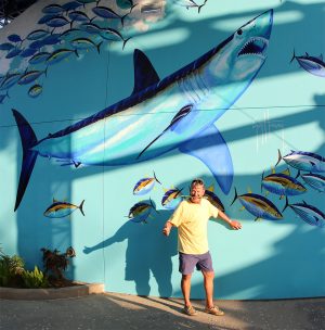 And so he keeps trying to get the name and the message out there. In recent years, Guy Harvey artwork has got to some pretty peculiar places. For example, there’s the hull of Norwegian Cruise Lines’ Norwegian Escape. The entire front of the massive cruise ship is covered in a Guy Harvey mural. He was recently in Orlando for the opening of SeaWorld’s new Mako roller coaster, for which he contributed a large mako shark mural. (“No, I’m not going to go on it, let’s make that clear,” he says of the coaster. “My kids can go on it.”)