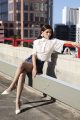 The Lace Shirt With Shoulder Pads by Helsa, $248, available at revolve.com. Pia Mini Skirt by More to Come, $110, available at revolve.com. 20 Denier Ultra Comfort Sheer Tights by Calzedonia, $20, available at calzedonia.com. Cream Floral Earrings by H&M, $35, available at H&M. Runa Slingback by Far, $395, available at revolve.com.