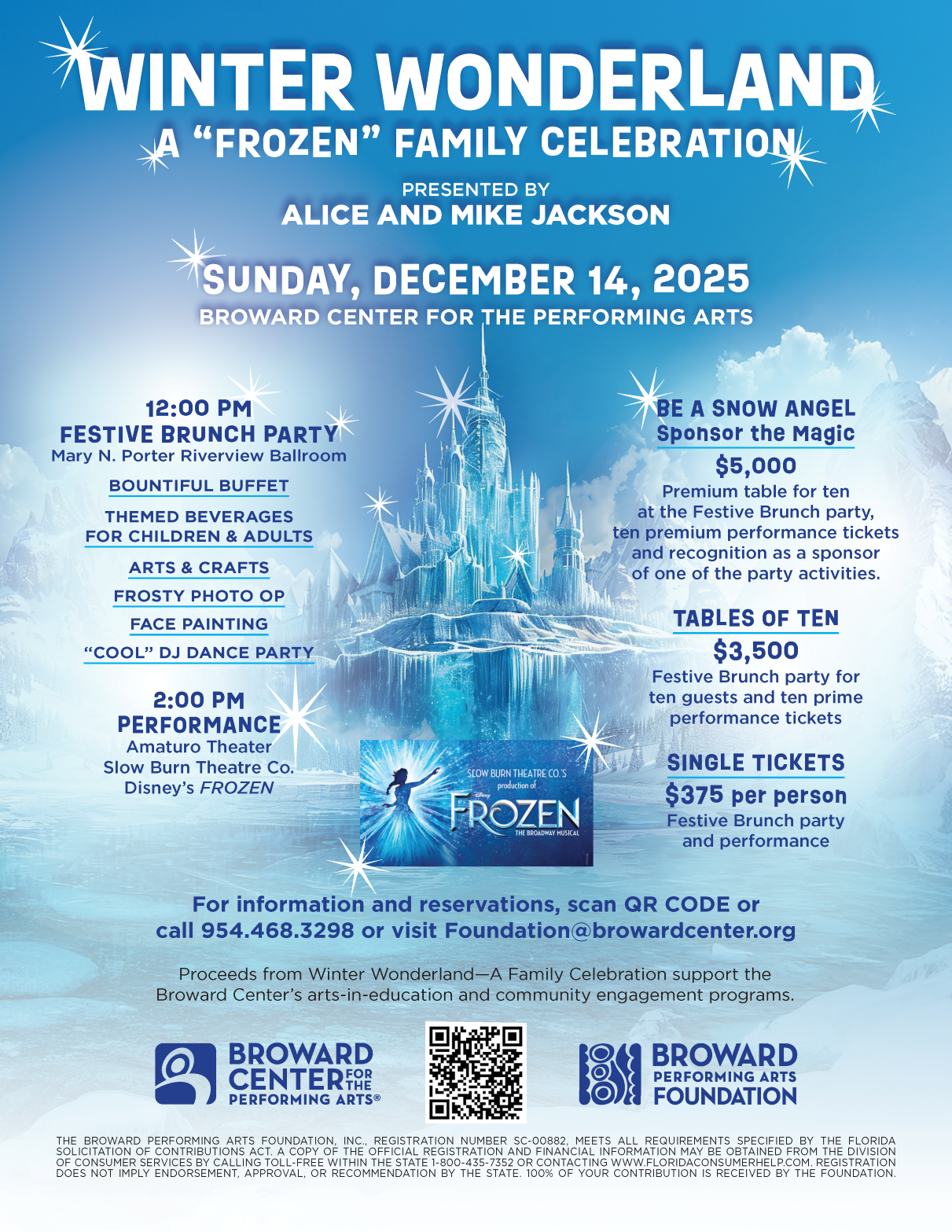 The Broward Performing Arts Foundation heats up the holidays with Winter Wonderland – A “Frozen” Family Celebration, an enchanting brunch party and performance of Disney’s Frozen at the Broward Center for the Performing Arts on Sunday, December 14. Proceeds benefit the Broward Center’s arts-in-education and community engagement programs.