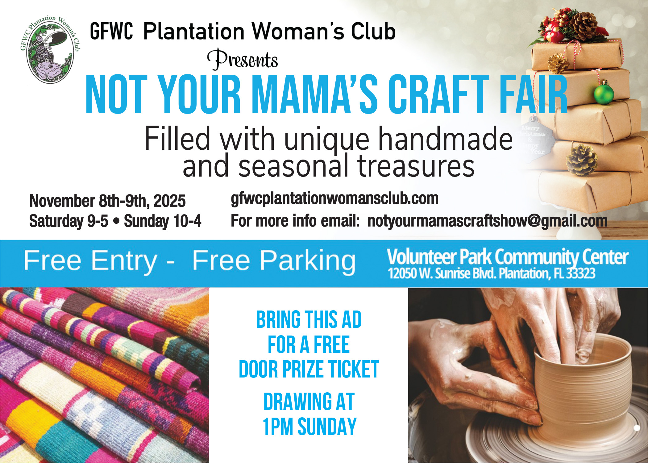 This November, the non-profit GFWC Plantation Woman's Club will be holding its two-day NOT YOUR MAMA'S CRAFT FAIR at Plantation's Volunteer Park Community Center located at 12050 West Sunrise Boulevard…