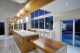 On the main floor, the attractiveness of the high ceiling enhances the open floor plan concept where there is less furniture and more open space. It leads to the open kitchen that features 15-foot windows, and a quartet countertop with steel and chrome chairs and accent pieces. The kitchen also features Jenn-air appliances, a pantry and a striking bar with counter-to-ceiling pocket windows overlooking the outside area that comfortably seats four.