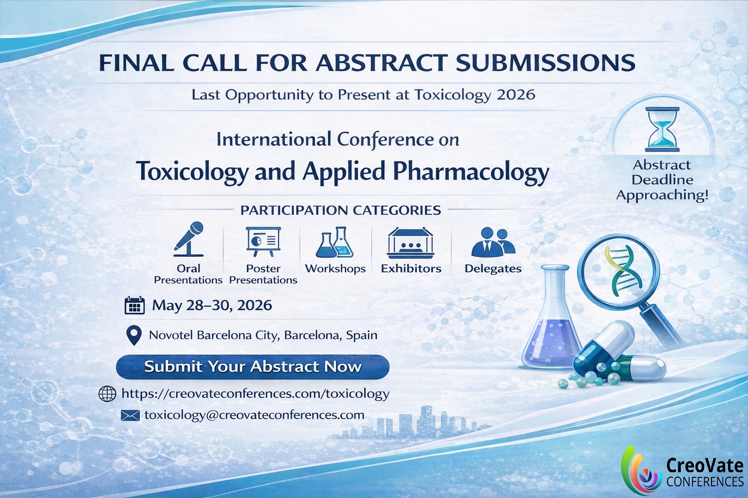 A Scientific Initiative by Creovate Conferences Conference Manager: Mr. Ram Charan The International Conference on Toxicology and Applied Pharmacology (Toxicology 2026) will be held May 28–30, 2026 at Novotel Barcelona…
