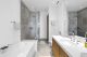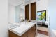 Upstairs, the primary suite claims its own wing. It features a private balcony, a sleek ribbon fireplace and a calming palette that lets the view do the heavy lifting. Two custom closets easily handle couture and gear. The bathroom feels like a gallery, with a sculptural metal soaking tub, a separate shower and generous vanities. It is equal parts spa and set piece.
