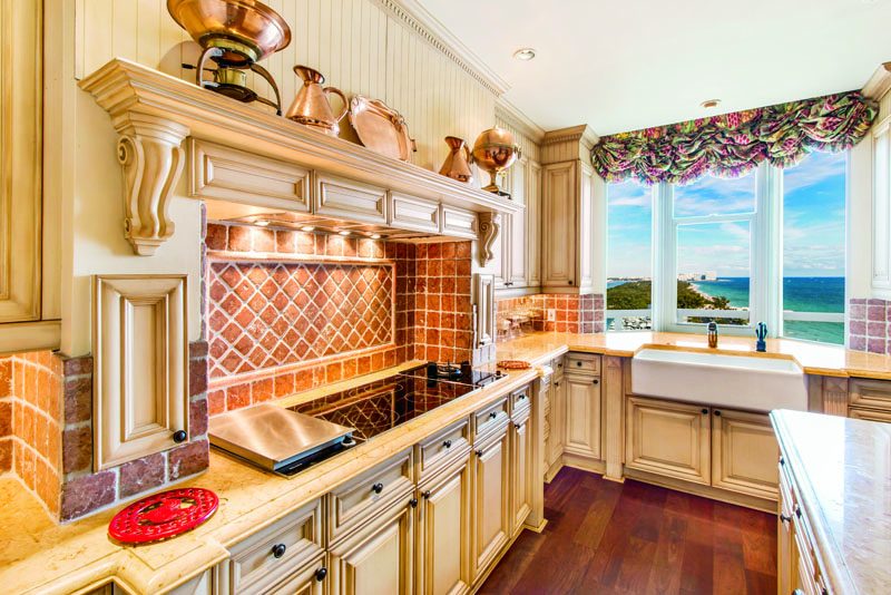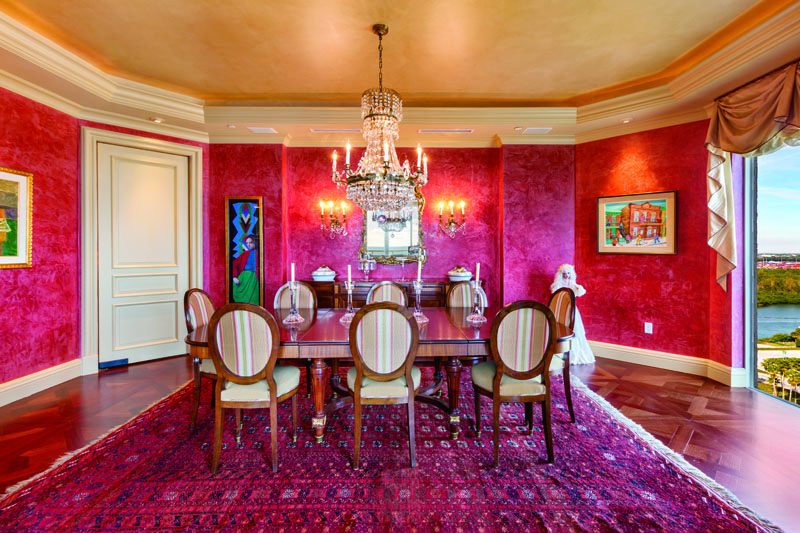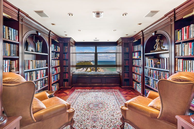 The townhome also boasts a foyer, formal dining room, serious chef’s kitchen, media room and wet bar, home office, library and private elevator to the second level. The master suite includes a morning bar, master bath, sauna and fitness studio. Building amenities include an equipped beachside cabana with direct beach access, storage room and three parking garage spaces.