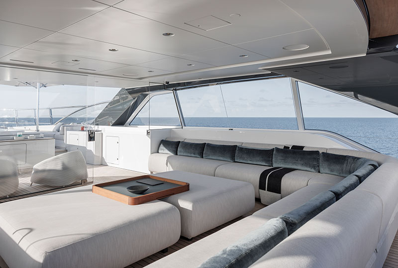 Step aboard, and it’s clear that Entourage was designed for living. Towering streams of glass pour light into the main salon, where floor-to-ceiling windows create a seamless dialogue between sea and sky. The elongated sundeck stretches invitingly across the horizon, offering generous space for lively cocktail hours and quiet morning coffees. The design flows in a way that feels less like a boat and more like a modern seaside residence.