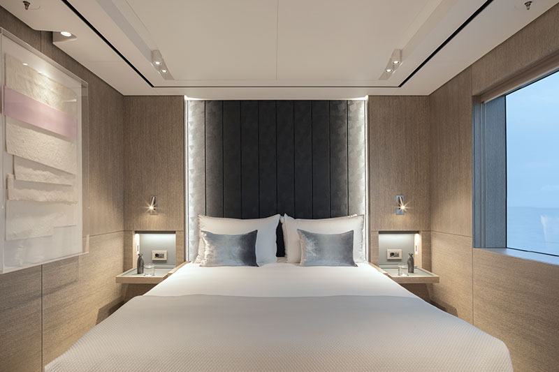 Accommodations are no afterthought. Up to 12 guests can settle into six expansive suites, including a full-beam primary retreat on the main deck. The primary offers thoughtful details usually reserved for five-star hotels: a private dressing room, his-and-hers bathrooms and a sense of privacy that feels cocooned yet open to the views beyond. The additional cabins are flexible, operating as doubles or twins to suit family gatherings or larger groups of friends.