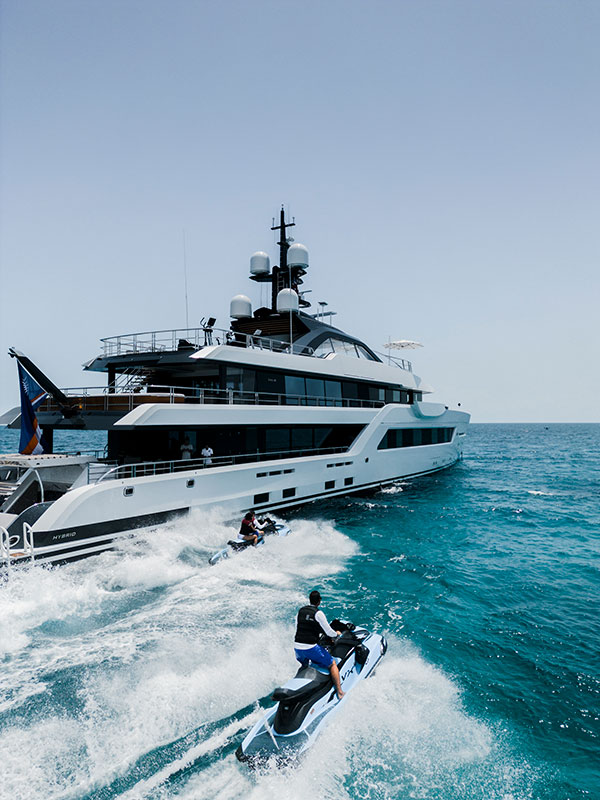 Then there’s the fun factor. A yacht named Entourage wouldn’t be complete without a full lineup of toys: Jet Skis, Seabobs, wakeboards, towables, even Flyboards for those who want to literally soar above the sea. A 42-foot HCB Lujo Chase Tender stands ready to whisk guests ashore in style. Add a beach club, deck jacuzzi and outdoor bar, and every day feels like three vacations in one.