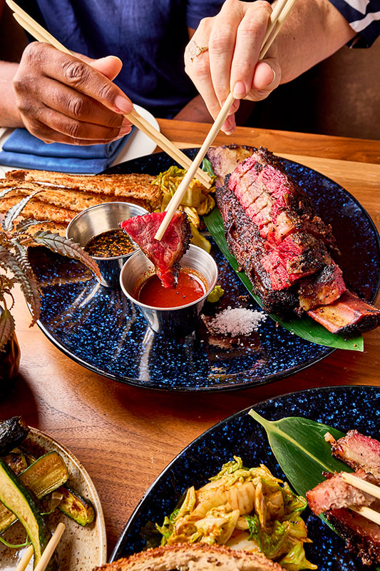 UKIAH blurs the line between American barbecue and Japanese soul food, not as a gimmick but as a point of view. The dish that captures that better than anything is the brisket (pastrami-brined with shichimi, smoked slow and low and served with housemade kimchi, yuzu pickles, wasabi and a Kyoto-Carolina barbecue sauce). He grins as he adds, “It has you remembering your last trip to Texas while booking your next trip to Japan.” The brisket arrives with Japanese milk bread, soft and warm enough that you instinctively start tearing it apart, stacking pieces of meat, kimchi, pickles and sauce into combinations that change with every bite. “I wanted a dish that tested my barbecue limits and delivered the umami complexity of my favorite Japanese flavors,” he says. “And the milk bread keeps it interesting for me all night.”