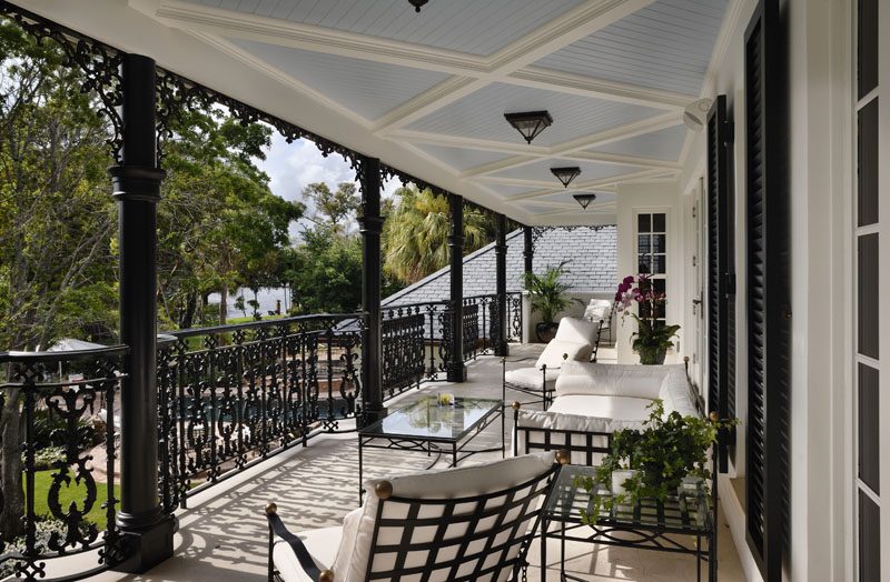 The “American Townhouse Style” adopted by the estate is apparent through the iron rail balconies that are reminiscent of the French Quarter. Inside, the staircase features an intricately detailed railing that mimics this theme. Also familiar to fans of New Orleans style are the asymmetrical windows throughout.
