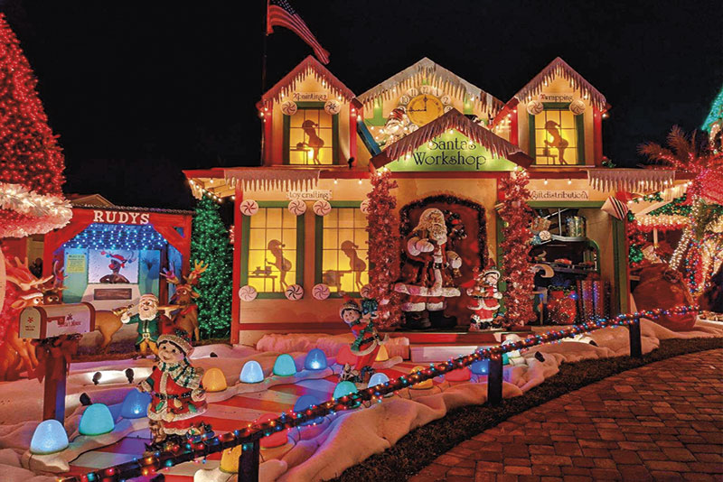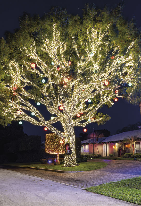 The Maceks’ holiday story began in the late 1990s when they moved into their Pompano home. Mark, a Michigan native and former Florida State football player, missed snowy winters and small-town Christmases. “We were in Florida, and I missed the snow and decorations,” he says. “We started doing a little bit on our own.” A neighbor wrapped the big oak in nets of lights one year. Then Bird, who had recently moved down the street, offered to help and the rest is Christmas history.