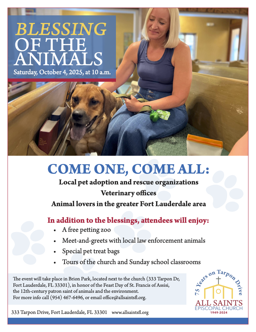 All Saints Episcopal Church in Fort Lauderdale invites local pet adoption and rescue organizations, veterinary offices, and animal lovers in the greater Fort Lauderdale area to join in its Blessing…