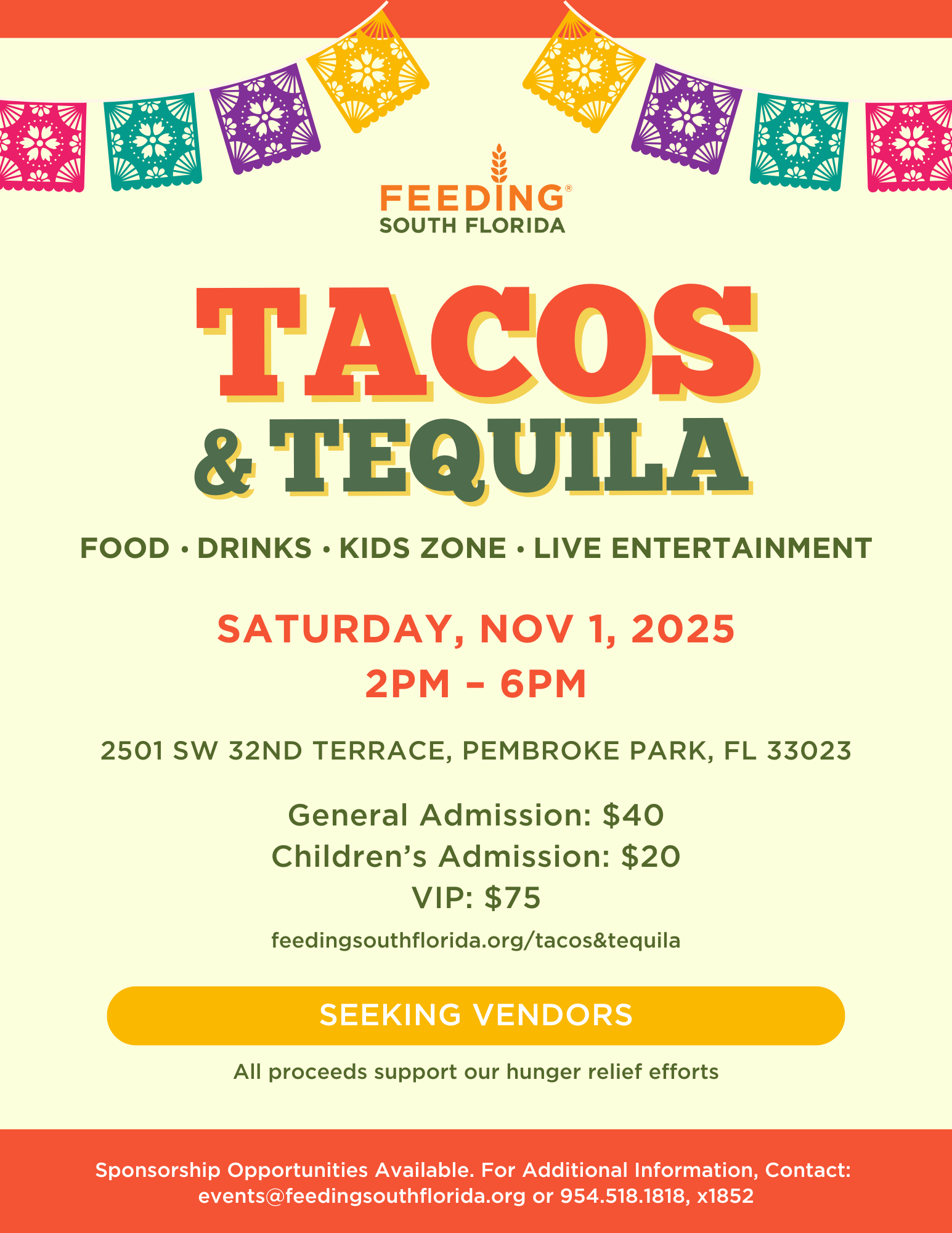 Feeding South Florida Pembroke Park Warehouse 2501 SW 32 Terrace, Pembroke Park, FL, United StatesJoin Feeding South Florida for Tacos & Tequila. This outdoor festival will feature some of South Florida's best tacos and tequila cocktails made by local bars, restaurants, food trucks, and…