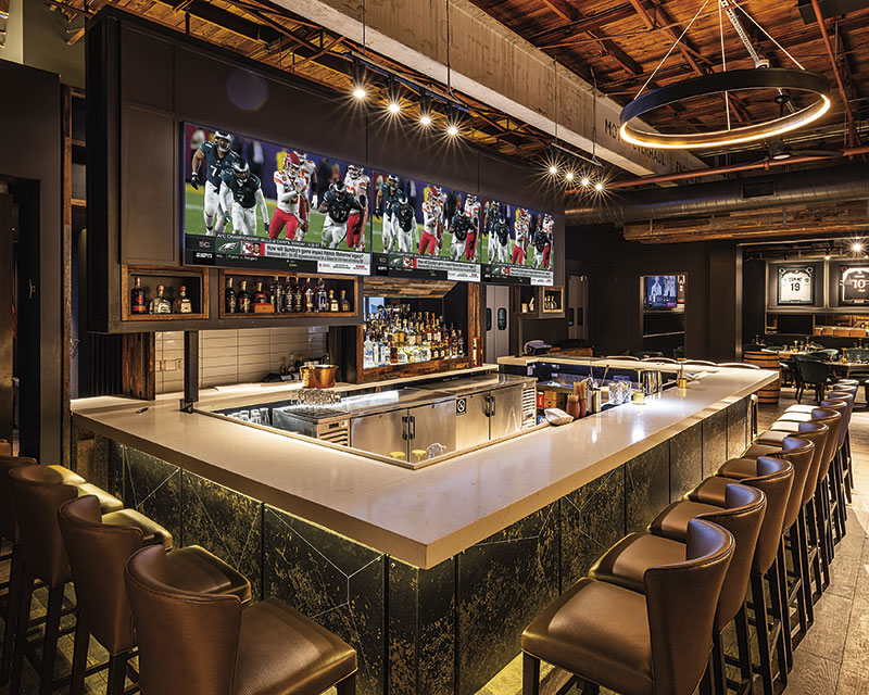 The D’s Sports Bar interior blends comfort and luxury, with plush emerald green seating, dark wood finishes and brass accents that create a warm, inviting atmosphere. The centerpiece is a sleek, illuminated marble bar, surrounded by high-definition screens that ensure an optimal viewing experience from every angle. The space combines sports-centric elements with upscale design, making it an ideal venue for both die-hard sports fans and those seeking a sophisticated night out.