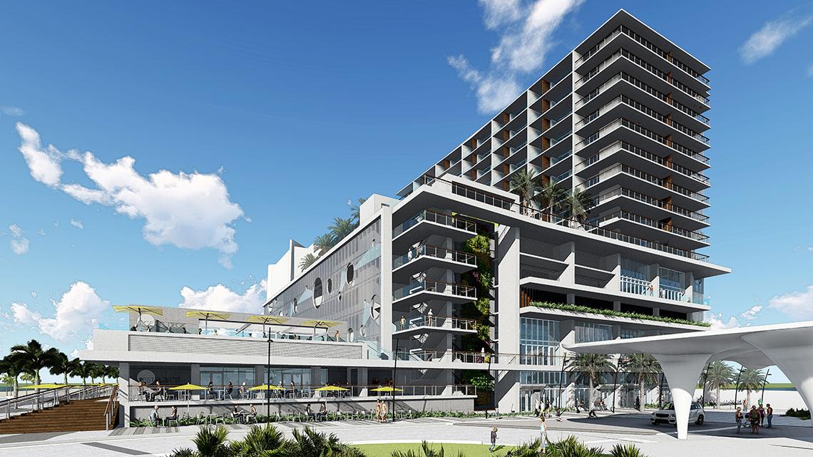 The planned mixed-use development, which would retain the name Beach Boys Plaza, encompasses a 16-story hotel with 205 rooms and a parking garage with 381 spaces.